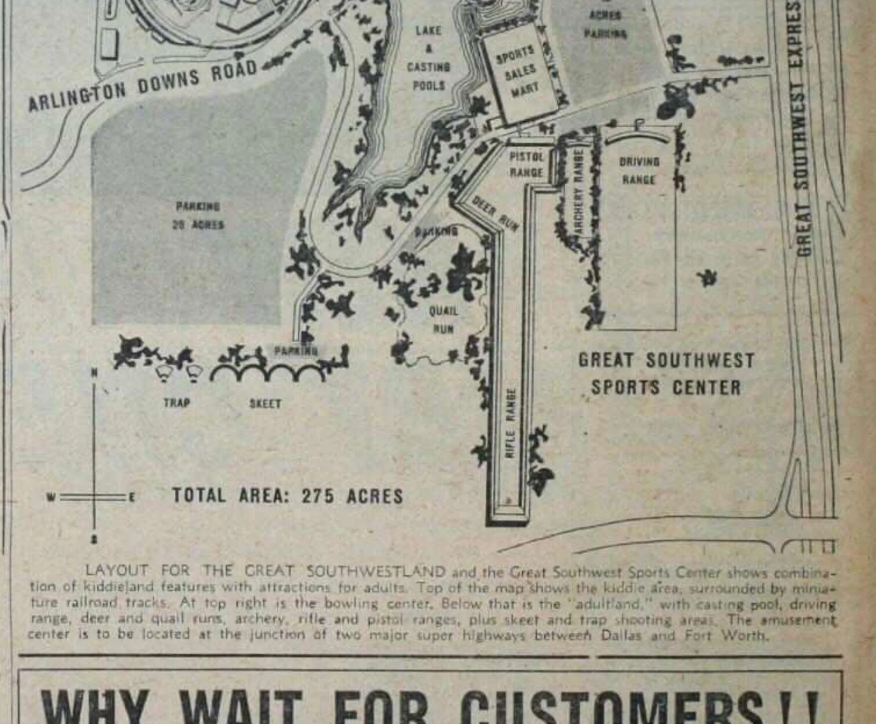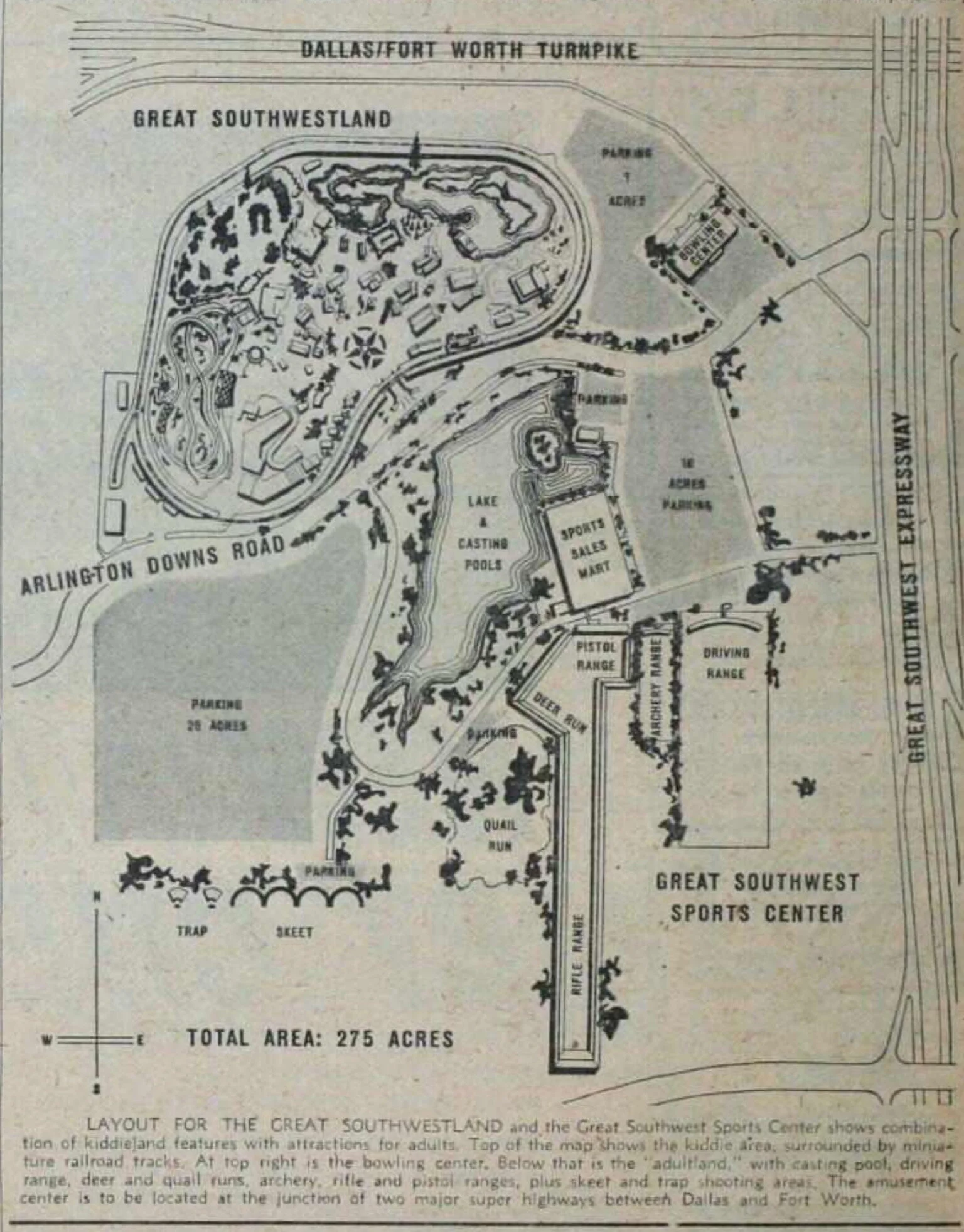 Angus Wynne’s ambitious plans for the property included not only the park, but lots of sports and shopping as well. Here is the article and map released in April of 1958 showing off what locals had in store for them. This article appeared in The Billboard (Billboard Magazine) April 7, 1958.
